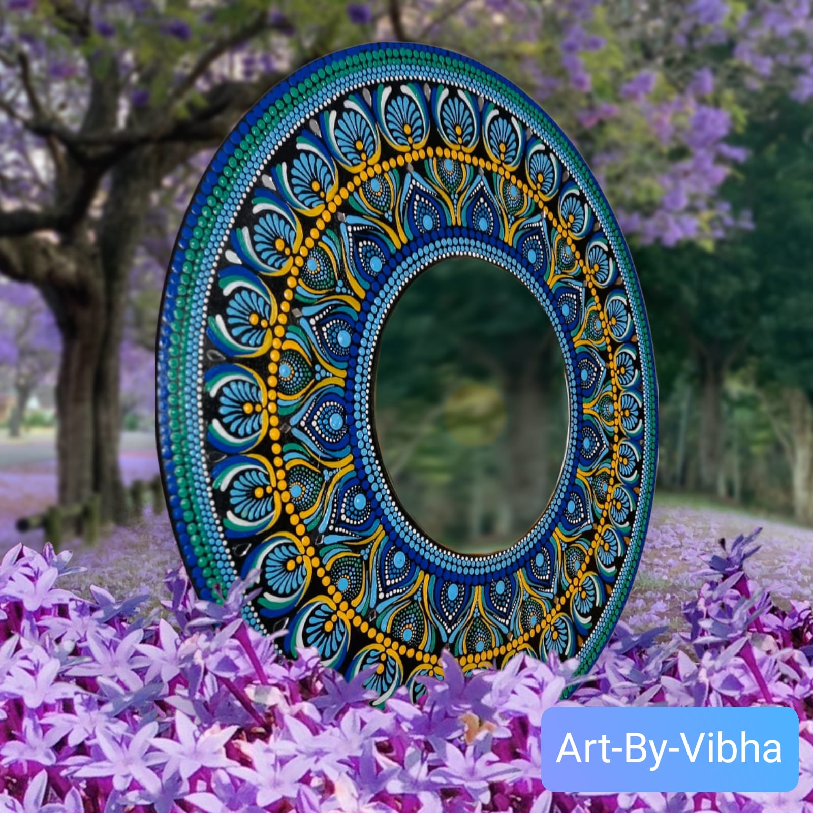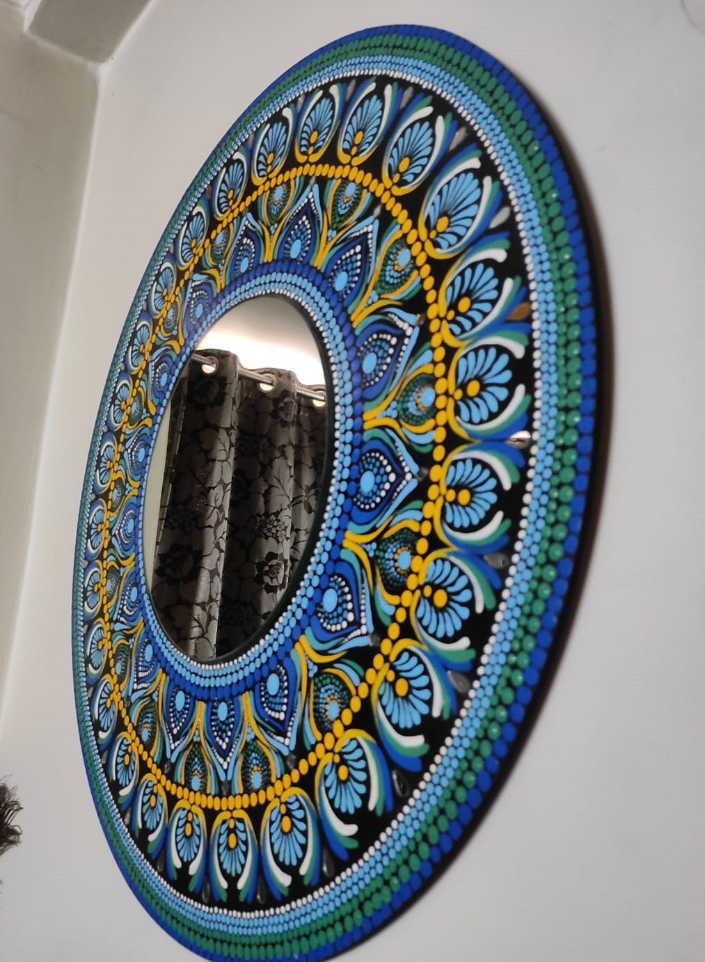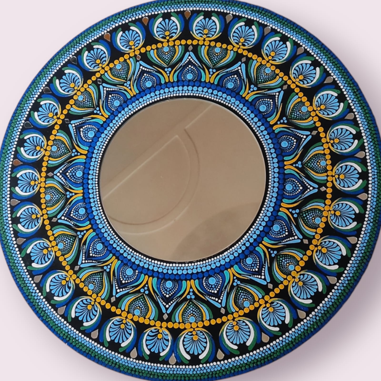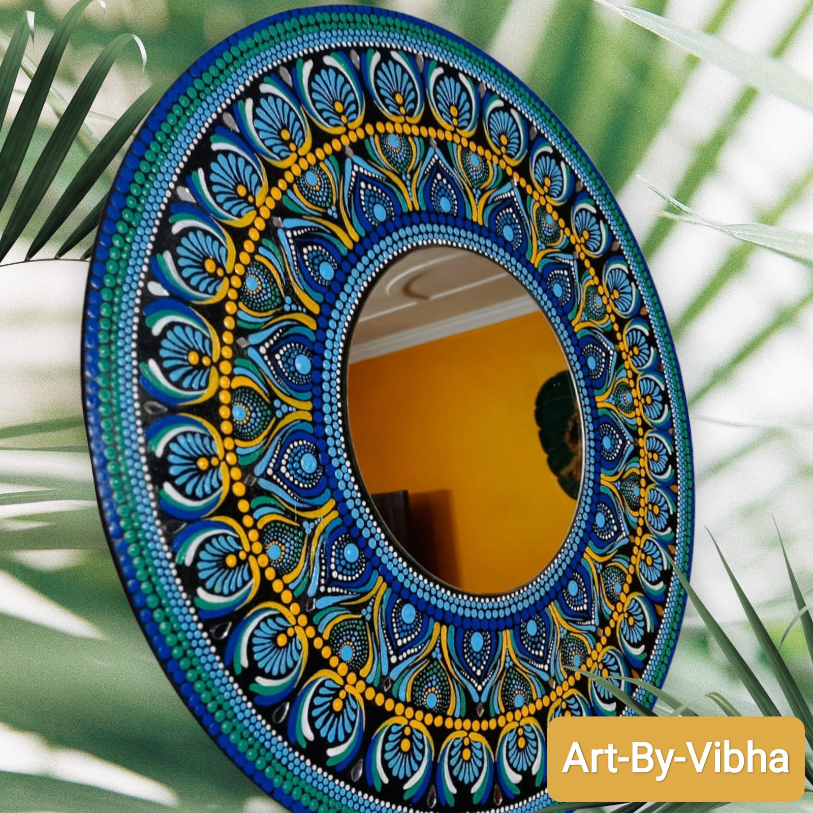 It highlights the use of a mirror with a painted mandala frame on MDF, referencing the structure commonly used in similar handcrafted decor items .“A 60 cm round mirror framed by a vibrant blue mandala hand-painted on MDF. The intricate dot patterns spiral outward from the mirror’s core, imparting a sense of deep tranquillity—a piece that reflects your image and anchors your spirit.” -