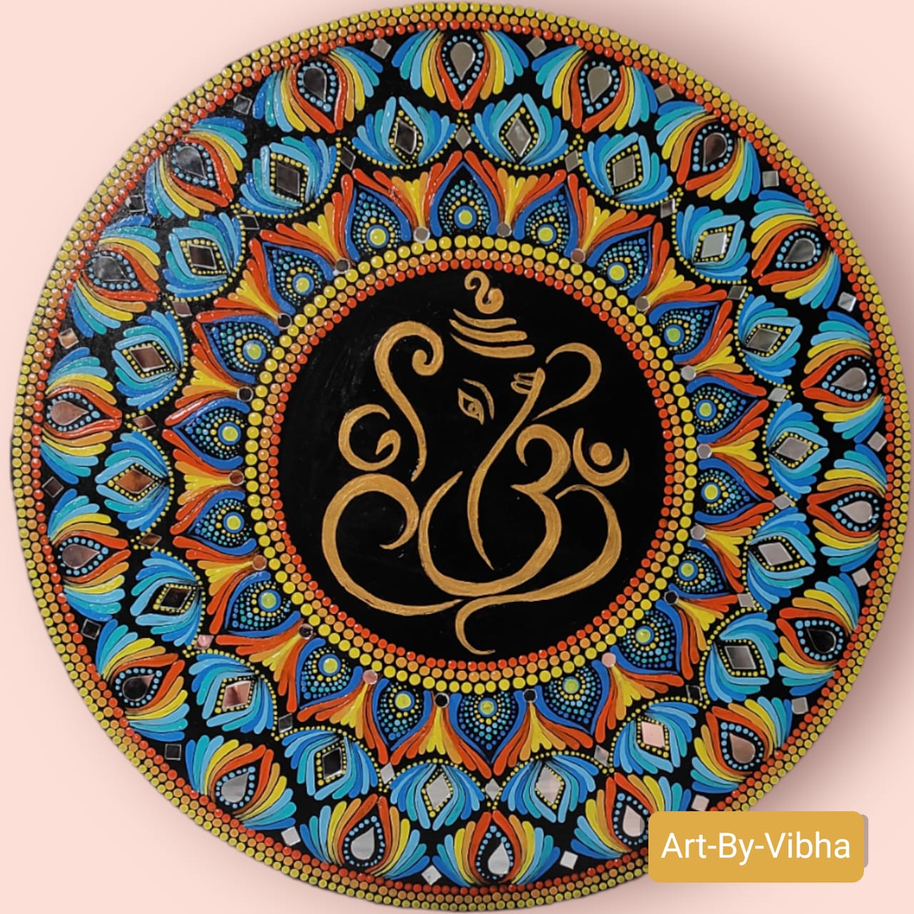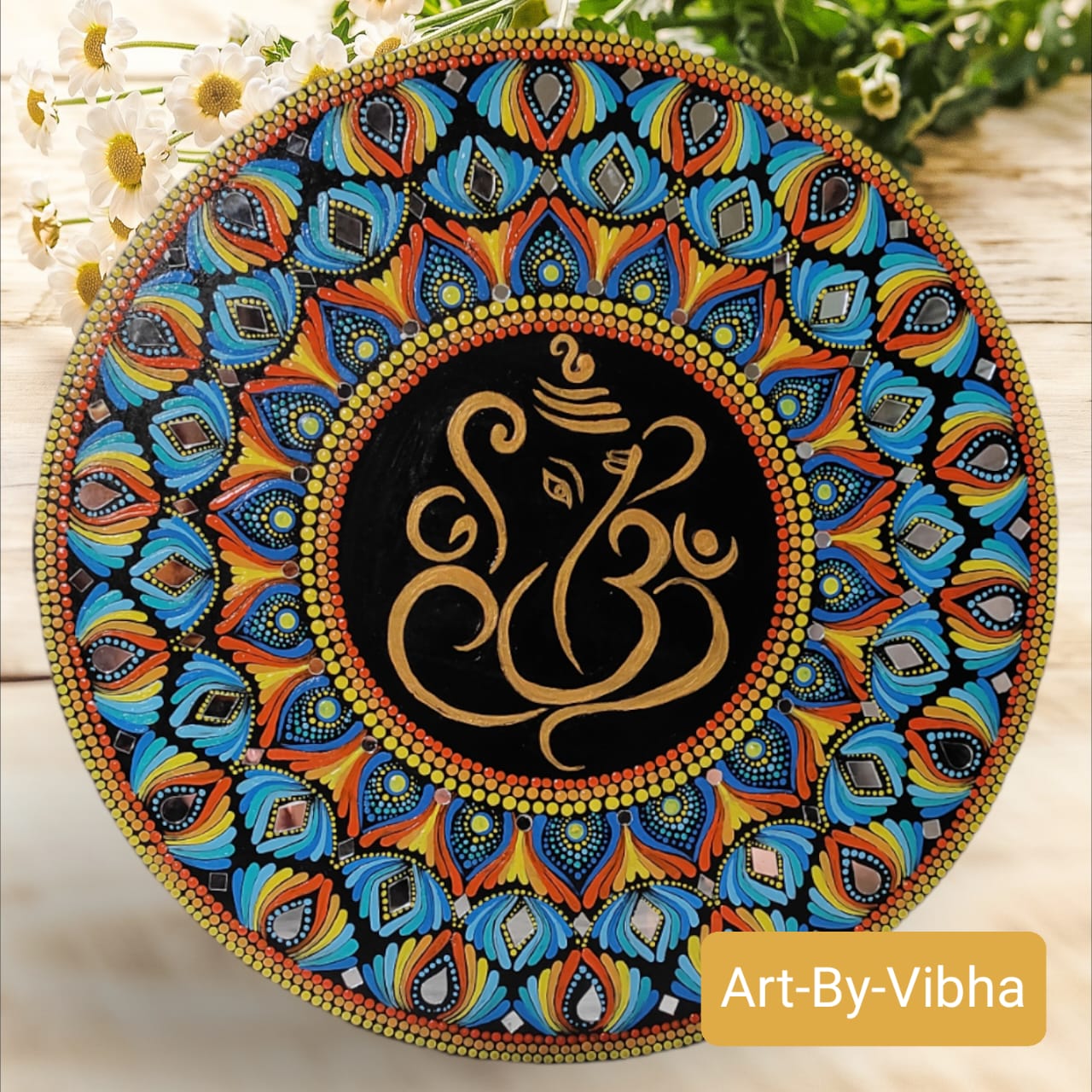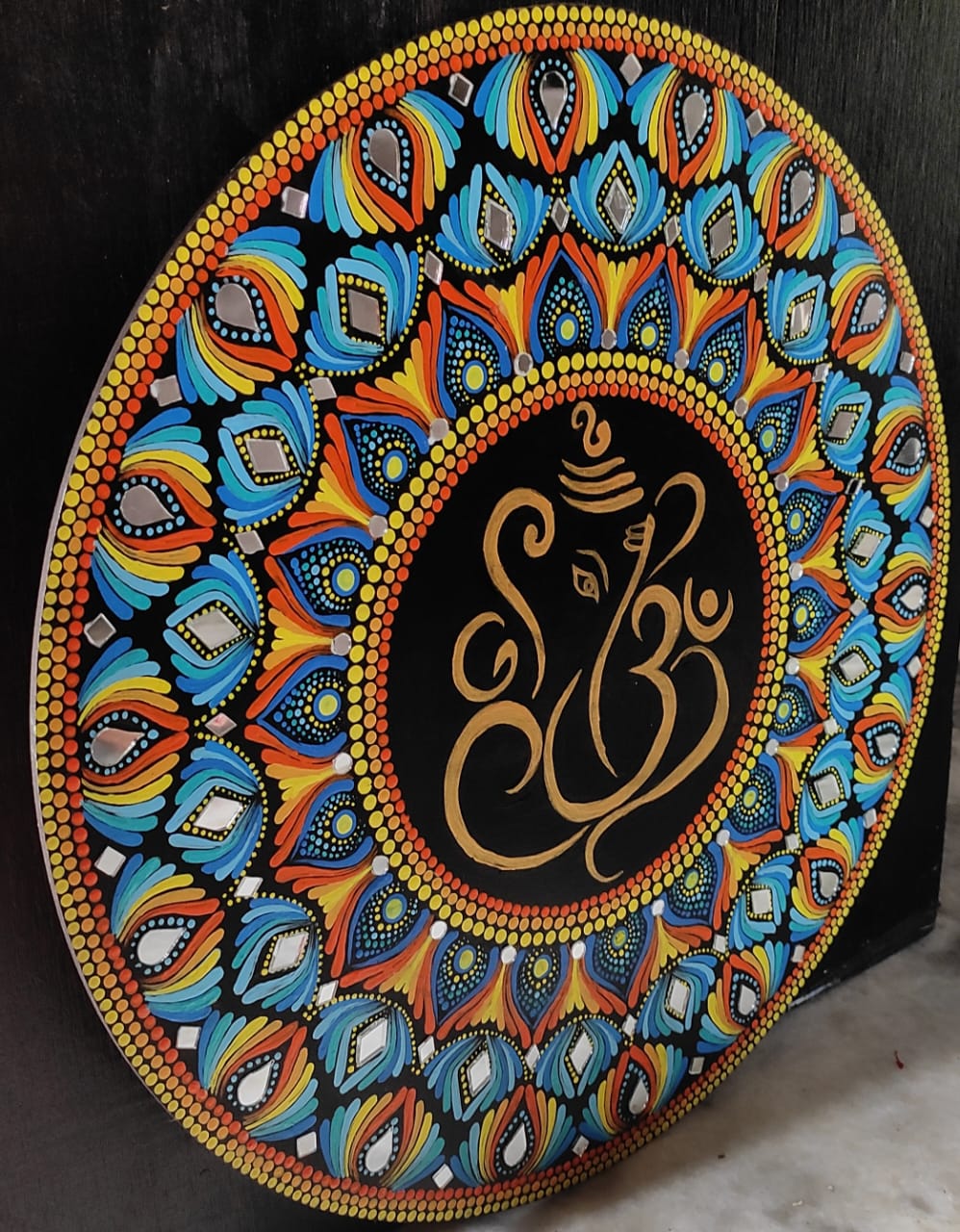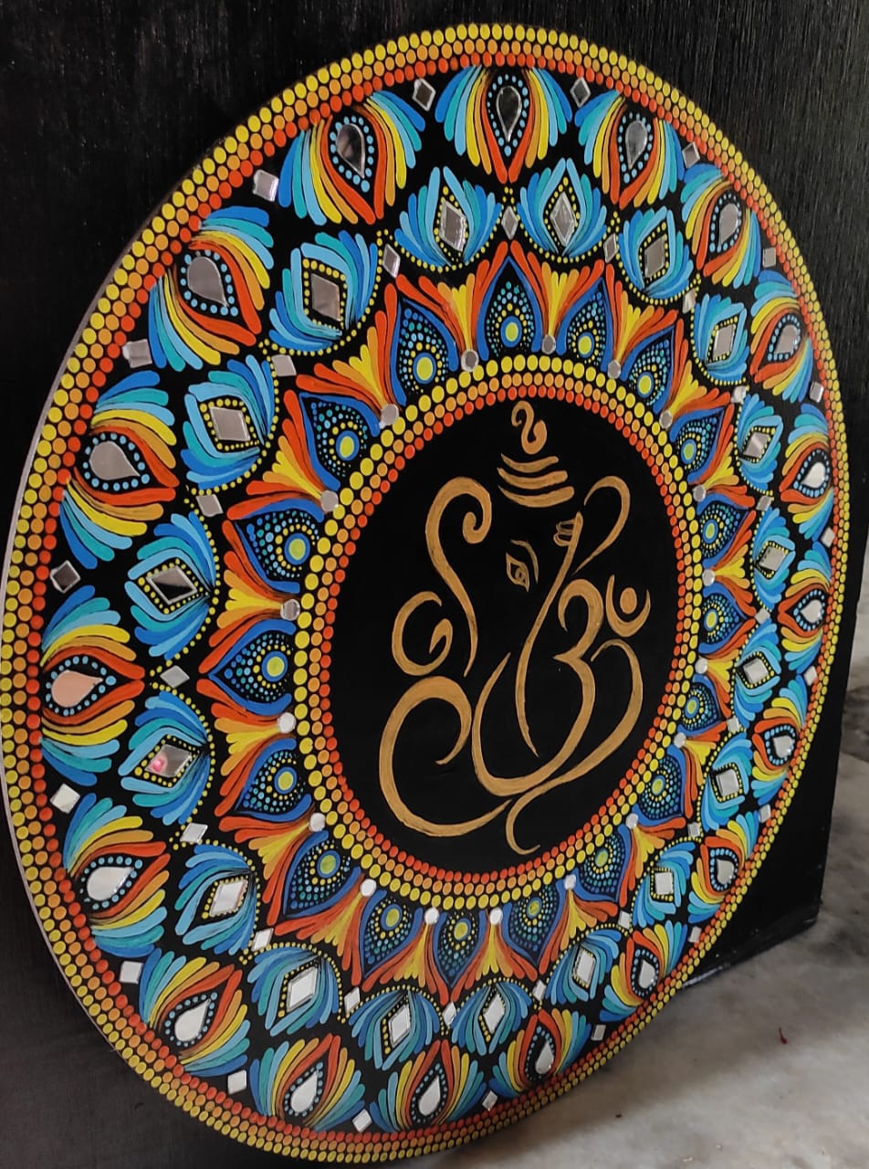 This handcrafted dot mandala painting features Lord Ganesha at its sacred center, surrounded by meticulously placed multicolour dot patterns that radiate balance, beauty, and spiritual energy.