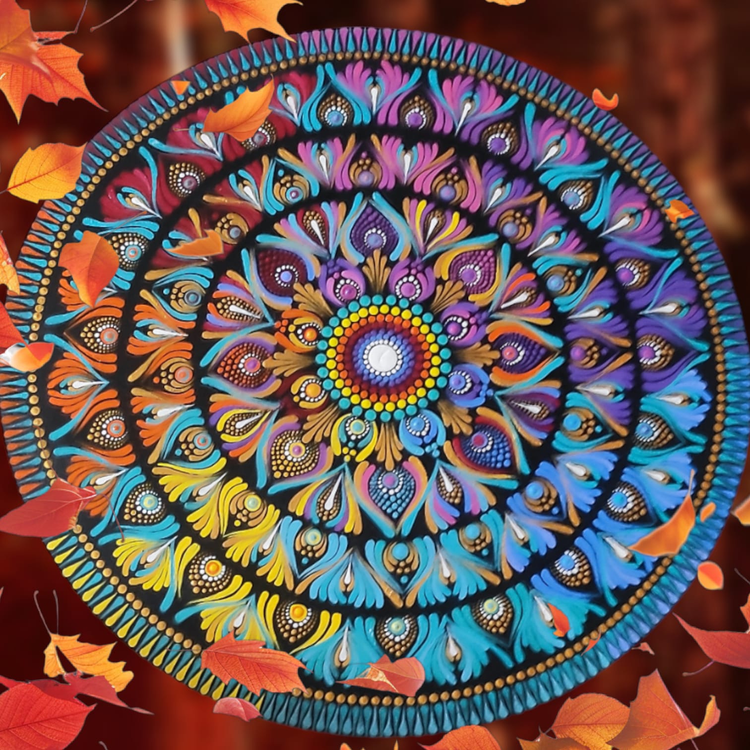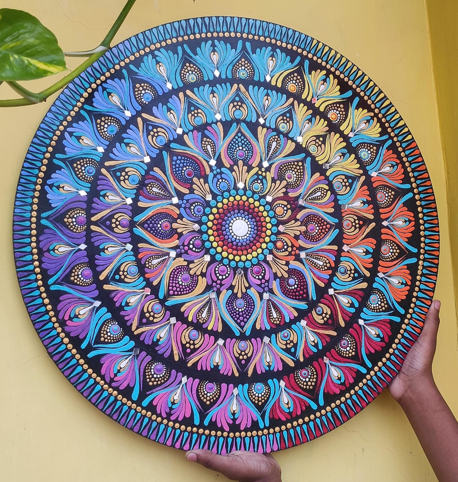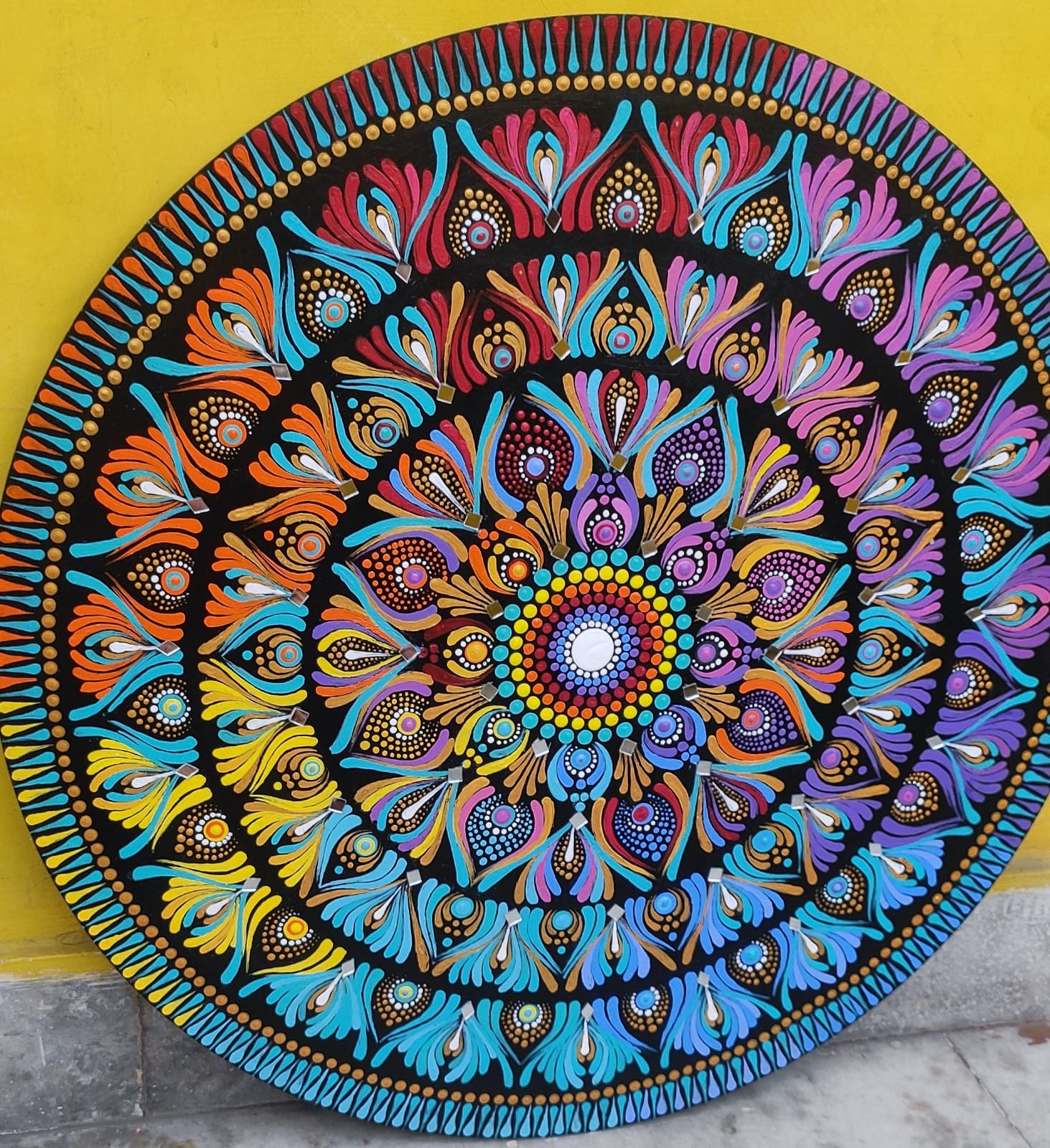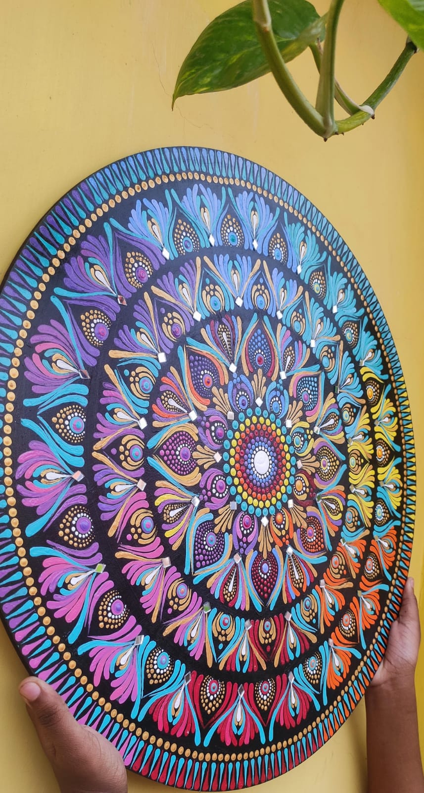 A harmonious mandala painted on a smooth 50 cm-diameter round MDF board, layered with rich acrylics in a serene off‑white and adorned with radiant mulicolour dots. Sealed with a protective decor varnish, it offers a balanced glow that’s both calming and luminous—perfect as a focal point in any tranquil space.”