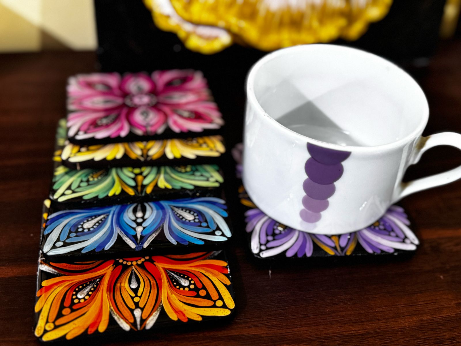 Our hand-painted multicolor coaster set combines functionality with artistry, making it the perfect addition to any home. With their unique designs and durable construction, these coasters are ideal for entertaining guests, making them both a practical accessory and a striking conversation starter. Transform your dining experience and showcase your love for creativity with these charming coasters!